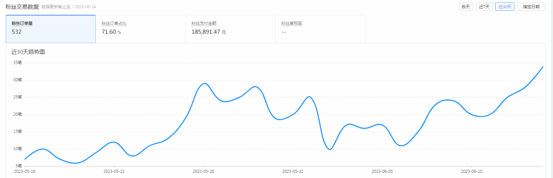 目前,粉絲訂單占比71.6%,粉絲復(fù)購(gòu)率在5.33%左右。靠著耐心和細(xì)心,將售前與售后配合起來(lái),店鋪在數(shù)據(jù)呈現(xiàn)上,減少了20%的售后率,也積攢了來(lái)之不易的口碑。