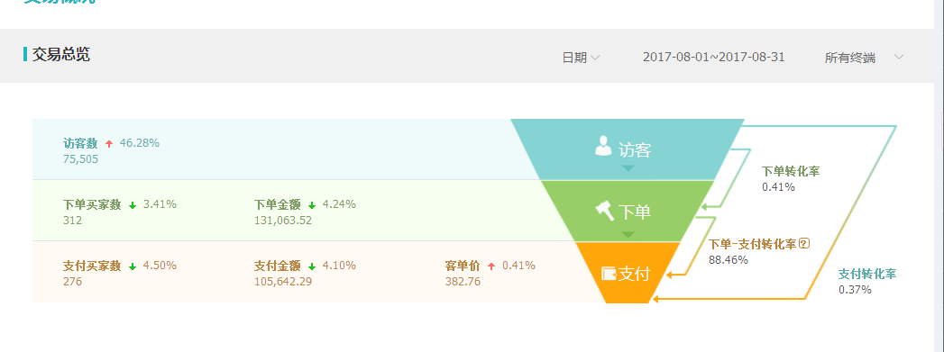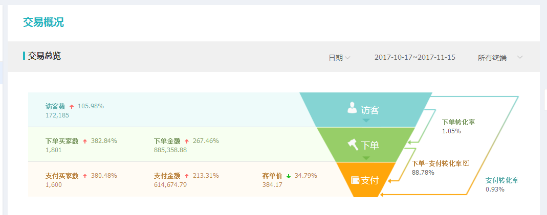8月底份接手以后,通過專業運營人員分析調整策劃,在10月中旬到11月中旬期間,訪客數量增長近10萬、增長率為105%以上,銷量增長超過1300單以上、增長率到達驚人的380%,交易金額突破50萬元的增長,增長率高達210%以上。取得的優異成績離不開火蝠店鋪運營人員辛勤付出。