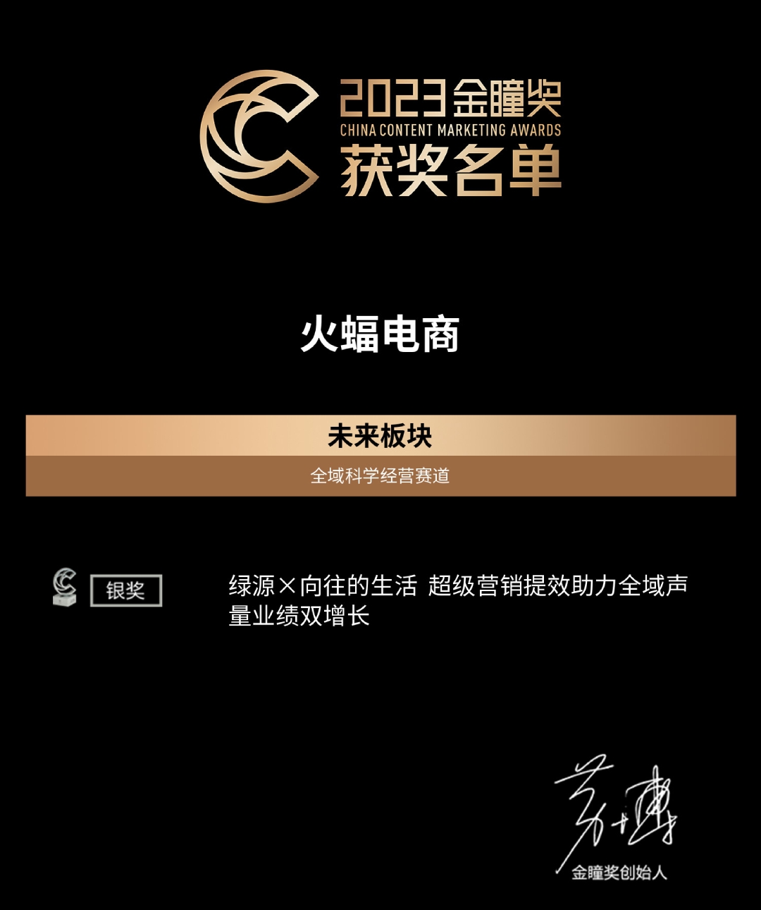 值得注意的是,火蝠電商所獲獎的金瞳獎「未來板塊」獎項單元中的「全域科學經營賽道」,是由金瞳獎與阿里媽媽的一次創新嘗試,在為品牌經營找到一條科學可復制、資產可沉淀的經營新方式,對所有敢于科學經營、全域突圍的品牌予以認同。金瞳獎授予火蝠電商【最具數智經營力品牌——銀獎】,旨在表彰其對數智概念的運用和成效的達成,面對營銷難點,以更智能的技術加持,實現達成更精確控制成本、更優渠道規劃布局,更多元營銷場景投放推薦的能力,以更加科學地設置投入產出。