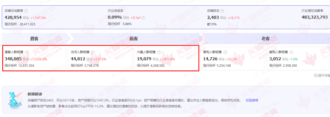 及時(shí)處理退款售后,加快物流和發(fā)貨攬收速度,提升店鋪DSR評(píng)分。針對(duì)用戶消費(fèi)情緒,火蝠電商更是做好了店鋪用戶體驗(yàn)管理舉措,及時(shí)做好安撫,適當(dāng)折扣讓利,減少差評(píng)和“問(wèn)大家”板塊等負(fù)面內(nèi)容的影響。截至十月下旬,品牌店鋪潛/新客資產(chǎn)結(jié)構(gòu)得到明顯優(yōu)化。潛客人群規(guī)模超過(guò)34萬(wàn),店鋪總消費(fèi)人次超過(guò)42萬(wàn)。