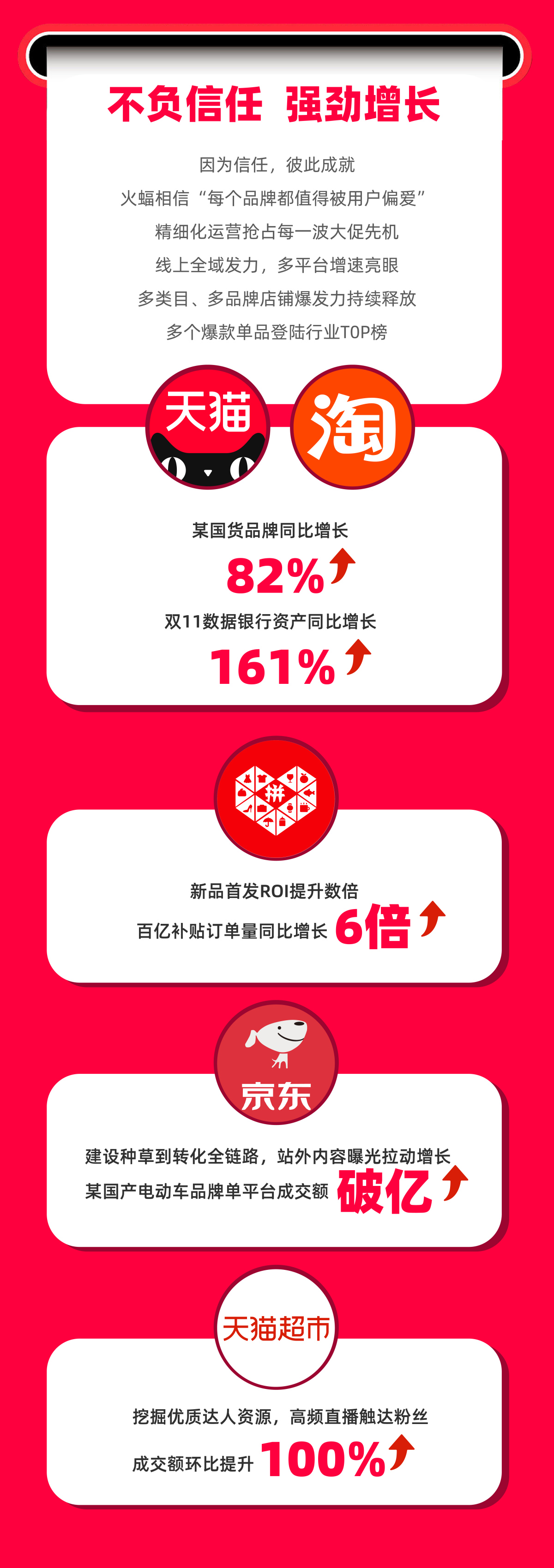 根據(jù)戰(zhàn)報數(shù)據(jù)顯示,在運營平臺方面,以小紅書、B站為代表的“新賽道”提速明顯,充分發(fā)揮著平臺“種草”能力;以天貓/淘寶、京東、拼多多、貓超為代表“傳統(tǒng)賽道”依然保持優(yōu)勢。火蝠電商服務(wù)品牌各平臺的核心數(shù)據(jù),同比去年雙十一期間,均保持較好增長態(tài)勢。