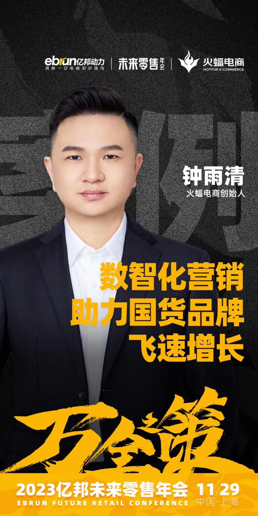 年會期間,火蝠電商CEO鐘雨清先生將親臨現(xiàn)場。以《數(shù)智化營銷,助力國貨品牌飛速增長》為命題,拆解頭部國貨品牌增長案例,為觀眾分享全域營銷時代下的數(shù)智化營銷戰(zhàn)略玩法,解析國潮消費路徑,找到品牌經(jīng)營的“萬全之策”,幫助商家實現(xiàn)確定性增長,擁抱新的機會。