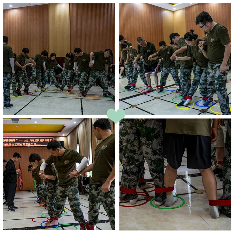 團隊成員站成一排,將相鄰兩人的雙腳綁在一起,依次穿過地上的呼啦圈且不能被觸碰到。游戲看似簡單實際卻極其考驗團隊共同進退的合作能力,這個項目能使隊員從中體驗感受步調一致團結協作的重要性。團隊成員需要與他人團結協作,步調一致才能最終走到成功的終點。