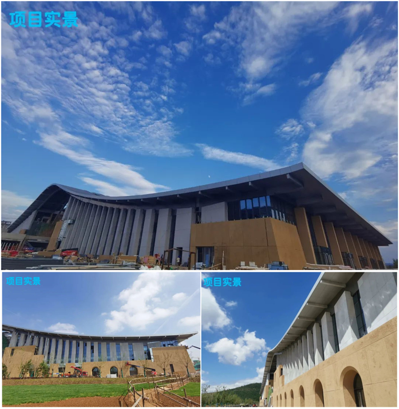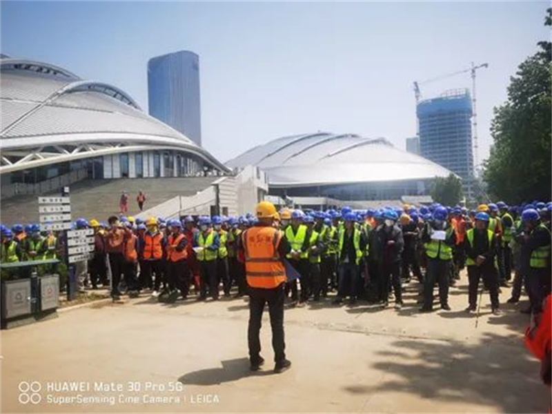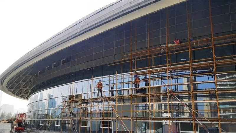 由于場館施工的復雜性,幕墻基本為異形造型,材料規格均為定制加工極為復雜。自2019年9月進場一直步入搶工階段,每天現場施工人數一百多人,2020年初疫情期施工高峰時,施工人數多達二三百人,全程無休假保證項目安全有序施工。