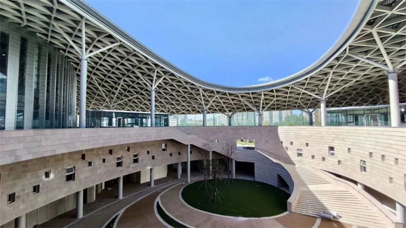 屋面月牙處造型更為復雜且設置有電動排煙開啟窗,主體屋蓋為雙曲面網殼結構。
