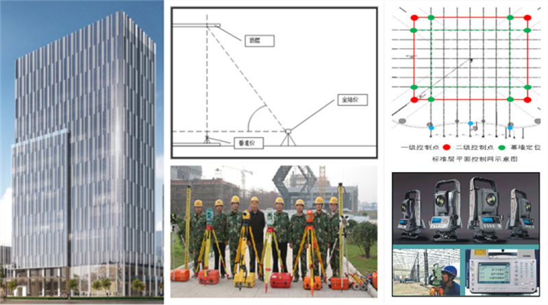 3、本工程兩塔樓玻璃幕墻裝飾條為錯縫造型,對于幕墻的測量放線難度較大,精度要求較高,是本工程的控制重點。