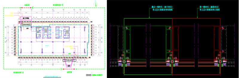 考慮到現場施工電梯和塔吊位置的影響,現場單元板塊安裝時需要預留數個單元板塊,待施工電梯和塔吊完全拆除之后再行安裝。這些收口單元板塊,采用雙母料的收口形式,保證從上向下插接時不會因為公立柱與上橫梁的干涉而無法安裝。