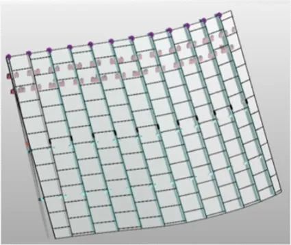 幕墻建筑多為曲面,定位復雜,幕墻立面與球形屋面交接部位高低起伏大且非規(guī)則形狀;屋面網架結構跨度較大,風壓作用變形對立面幕墻影響大;曲線形狀且平面尺度大、收邊收口多。