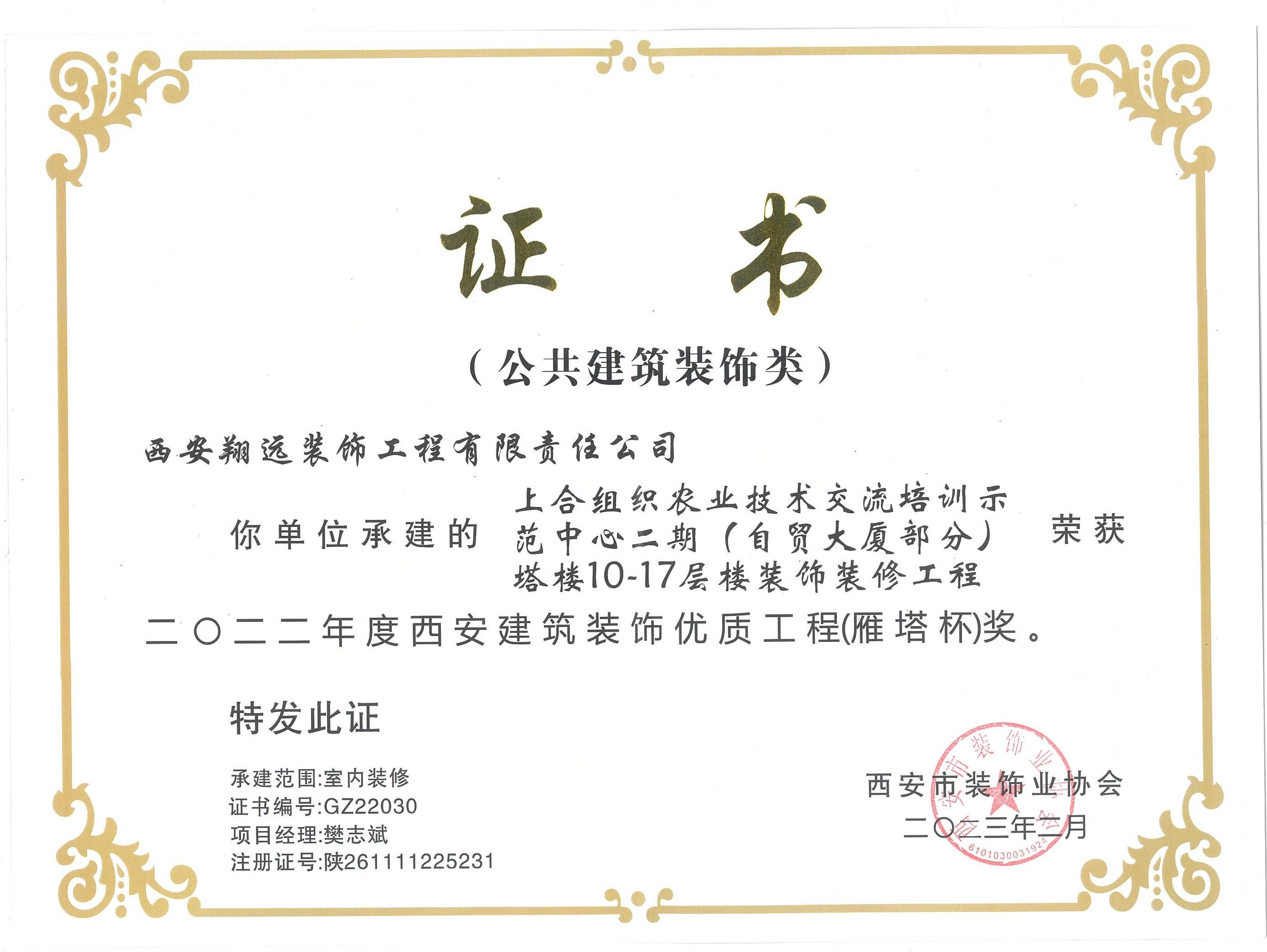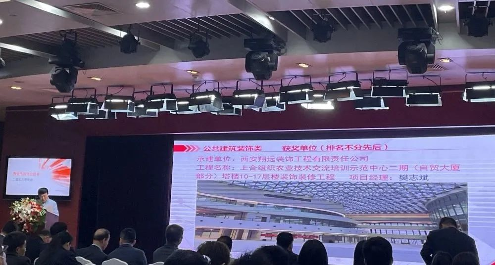 由西安翔遠裝飾工程有限責任公司承建的上合組織農業技術交流培訓示范中心二期(自貿大廈部分)裝飾裝修工程,在本次評優表彰活動中榮獲“二零二二年度西安建筑裝飾優質工程(雁塔杯)金獎”