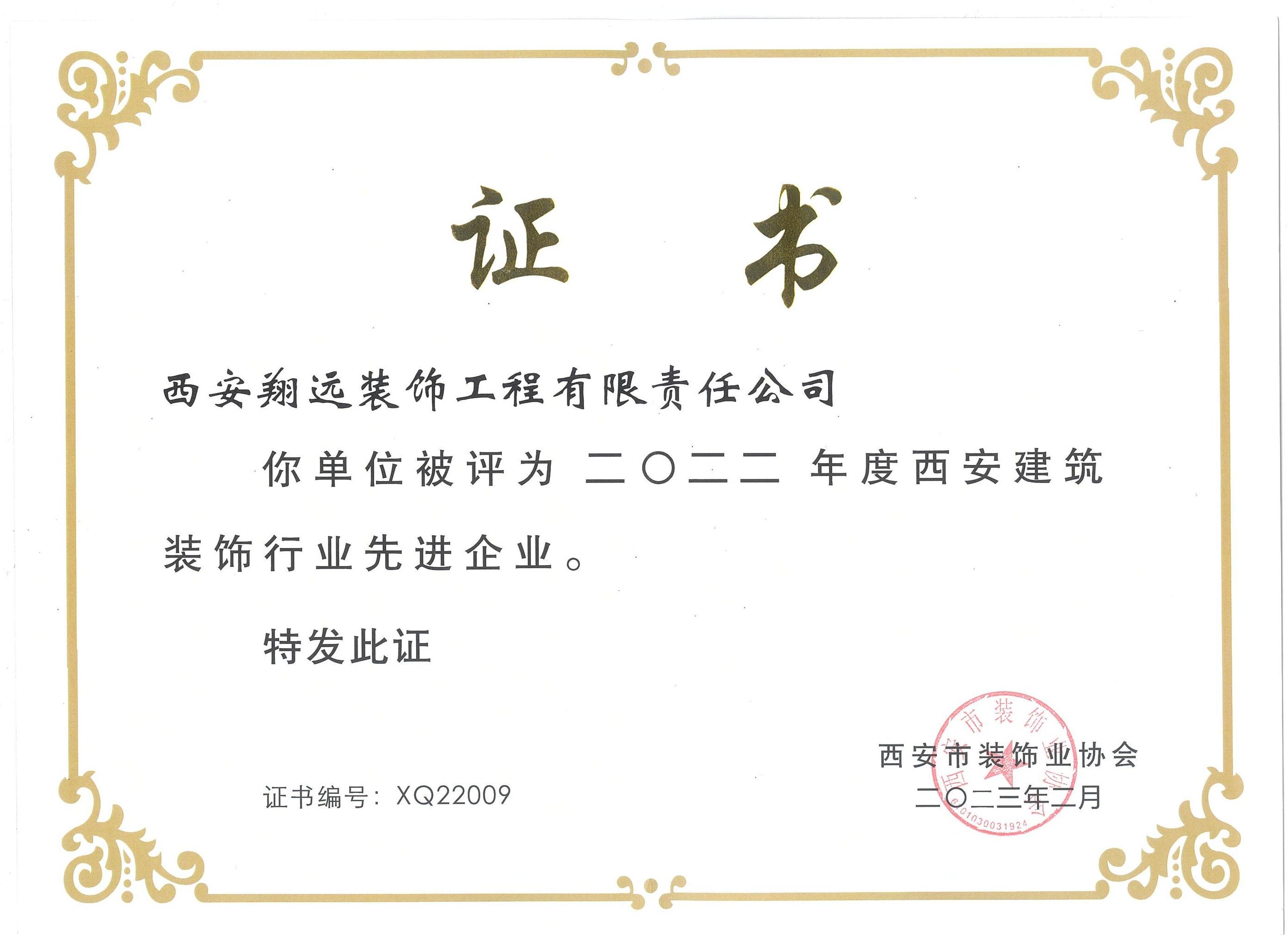 西安翔遠裝飾工程有限責任公司被評為“2022年度西安建筑裝飾行業先進企業”