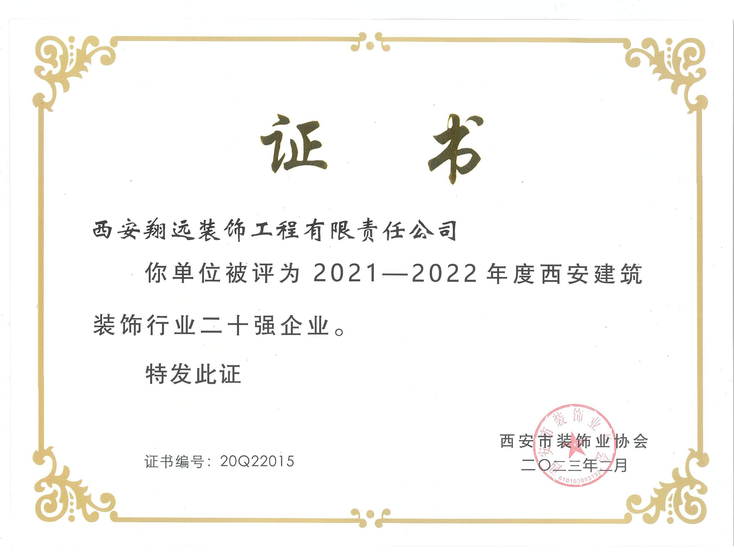 西安翔遠裝飾工程有限責任公司榮獲“2021-2022年度西安建筑裝飾行業二十強企業”