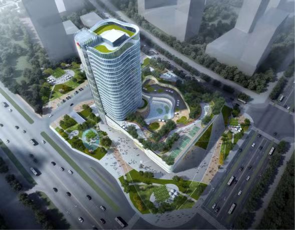 建筑外部形態簡潔現代,充分考慮與周邊城市空間和道路的關系。裙房部分以橫向為主,連續舒展,塔樓以豎向為主,積極挺拔。為創造更優的共享空間和景觀朝向,建筑東南角設有通透的生態景觀共享廳,晶瑩剔透,尤為矚目。