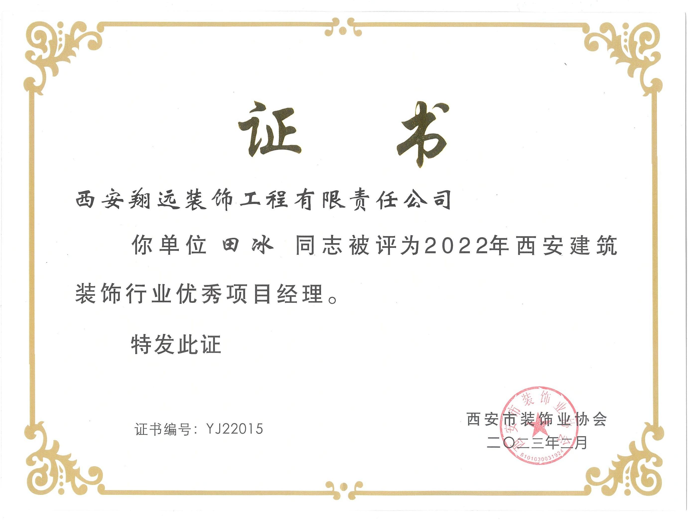 我司項目經理田冰同志,在本次評優表彰活動中評為“2022年西安建筑裝飾行業優秀項目經理”