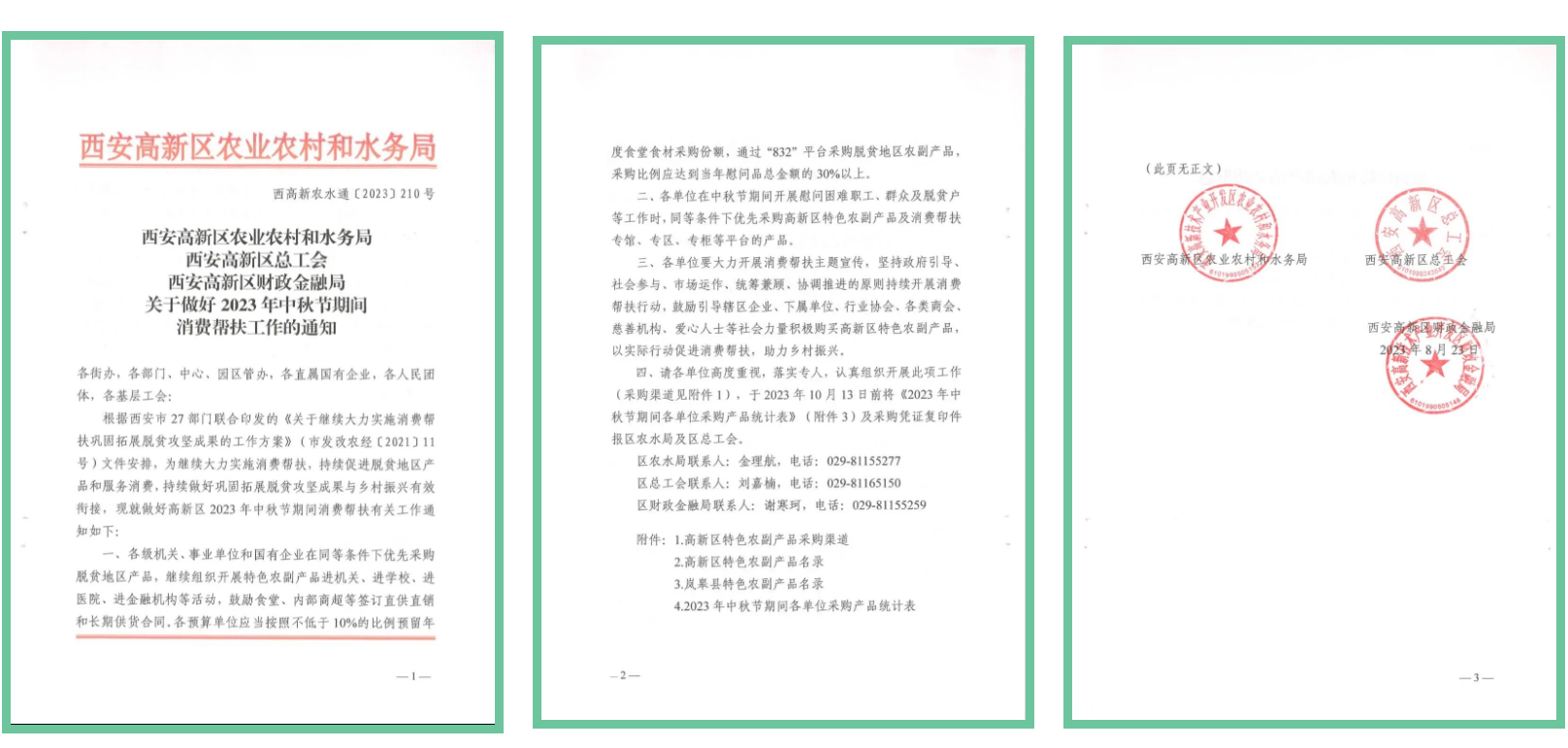2023年8月23日,西安高新區(qū)農(nóng)業(yè)農(nóng)村和水務(wù)局、西安高新區(qū)總工會(huì)、西安高新區(qū)財(cái)政金融局發(fā)布關(guān)于做好2023年中秋節(jié)期間消費(fèi)幫扶工作的通知。鼓勵(lì)各單位、各企業(yè)在同等條件下優(yōu)先采購(gòu)脫貧地區(qū)產(chǎn)品,組織開(kāi)展特色農(nóng)副產(chǎn)品進(jìn)機(jī)關(guān)、進(jìn)醫(yī)院、進(jìn)各大機(jī)構(gòu)等活動(dòng)。要求各單位大力開(kāi)展。消費(fèi)幫扶主題宣傳。