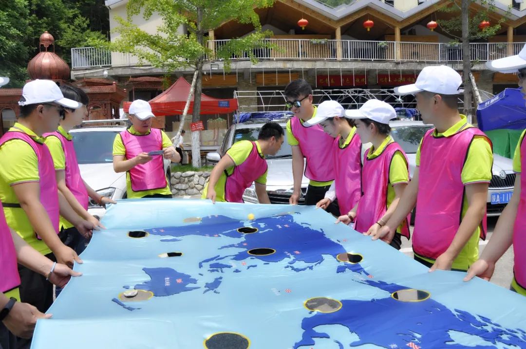 團隊成員必須雙手拉地圖邊緣,球必須穿過地圖上的七大洲四大洋,按照指定的路線,到達指定的終點項目挑戰成功。