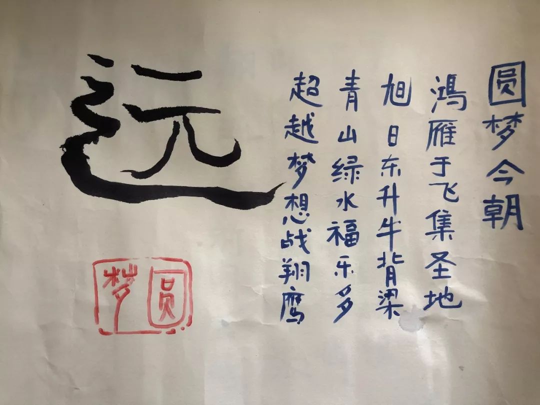 直徑1.5m圈外,每人一根繩子,用清水在地面上練習。在團隊比拼時,要求合力在教練派發的白紙上完成“翔”和“遠”,并以此字為主題,結合團隊成員每個人的名字完成一首七言絕句,綜合表現得分高的隊伍獲勝。