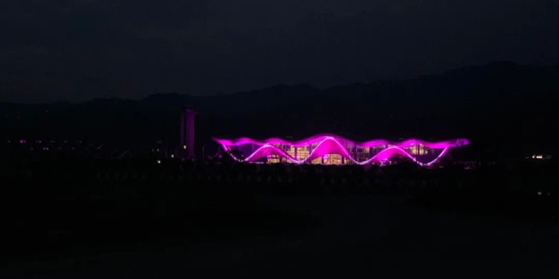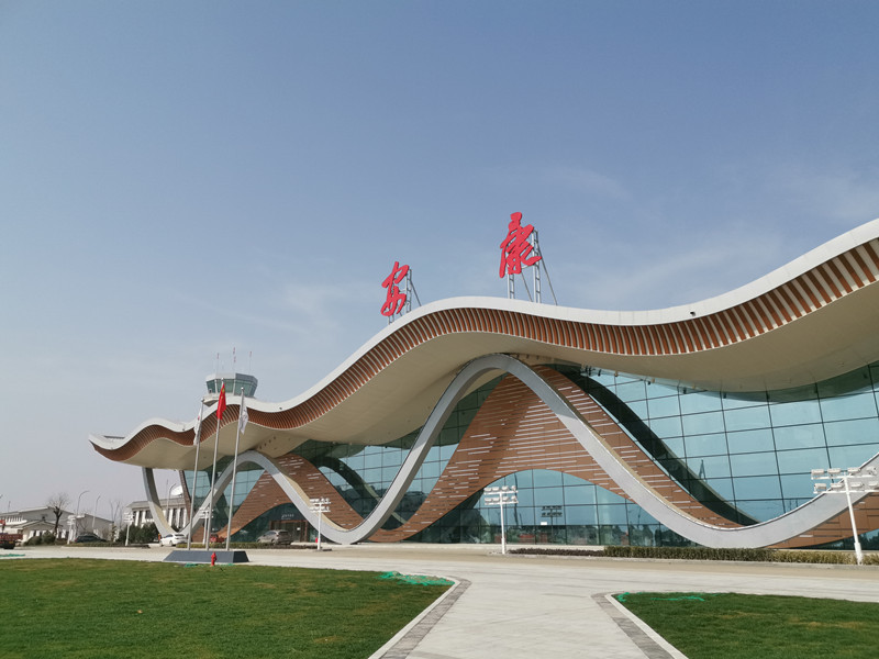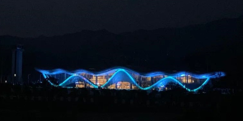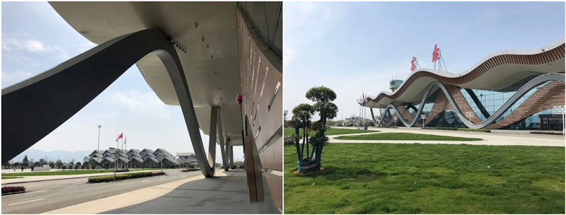 航站樓鋼飄帶取山造型,航站樓屋檐取水造型,兩者相呼應,以藍天為背景,構成山水一色的建筑特點。
