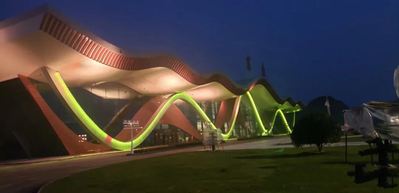 航站樓屋檐正面水飄帶鋁板取金屬白色為基調,以藍天為背景,形成天水一色的特點,屋檐吊頂底面水飄帶鋁板采用建筑櫞子造型,以象征原木的金屬棕銅色為基調,以相對深色的色調來表現出屋檐正面水飄帶的飄逸效果。正立面波形鋁板以香檳金色為背景基調,象征安康人民世世代代繁衍生息的黃土地。正立面玻璃以深藍灰為基調,以達到白天能遮擋室內的建筑結構及鋼結構等物體,夜晚顯現室內外燈光星空效果。正立面鋼飄帶以深藍灰為基調,其波形象征金州安康的發展一浪高一浪。